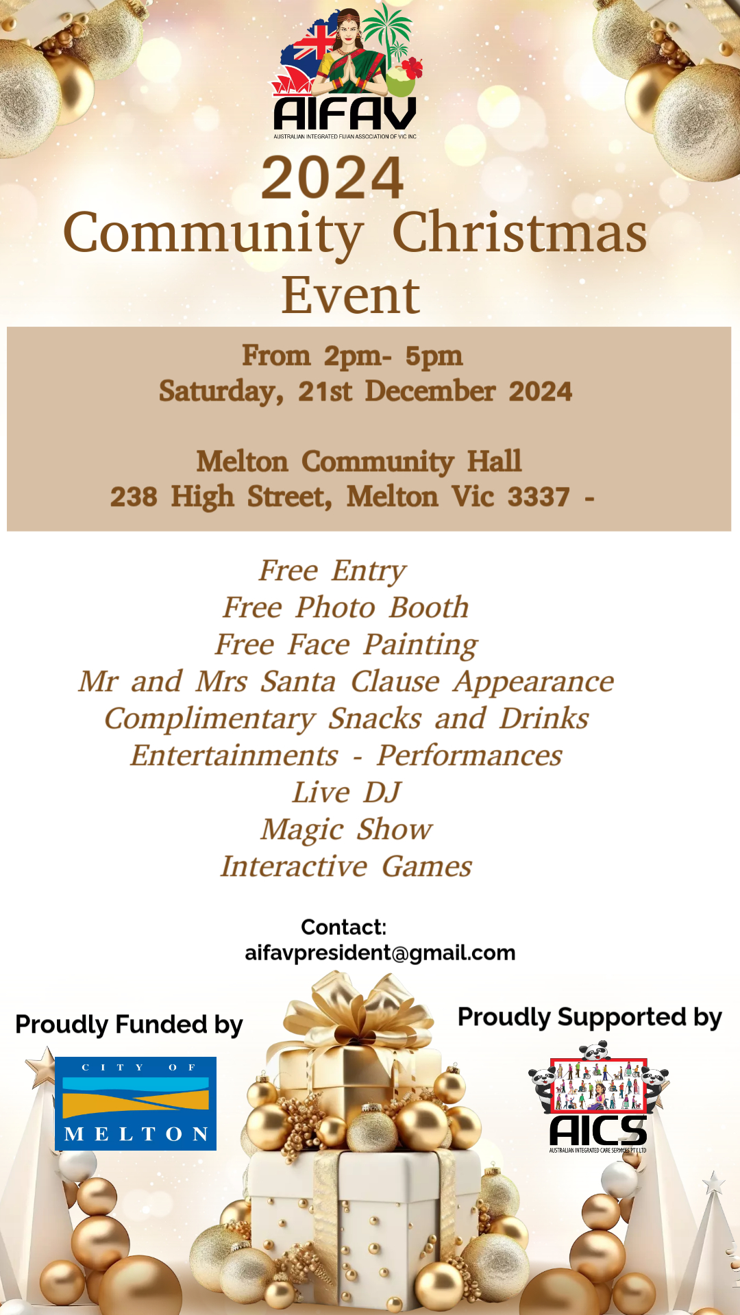 2024 Free Community Christmas Event hosted by the Australian Integrated Fijian Association of Victoria (AIFAV)!